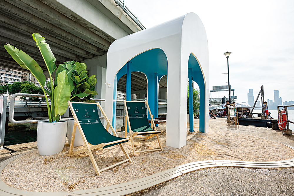 作品AaaM Architects的「北角·小『嶼』」,藝術家在北角碼頭空地上建造出的微型沙灘,將海邊的氛圍與能量帶入社區;#築隊的「#築角」,藝術家則以與街坊共同回收而來的塑料瓶,製成透明頂篷,炎夏中帶來清涼。