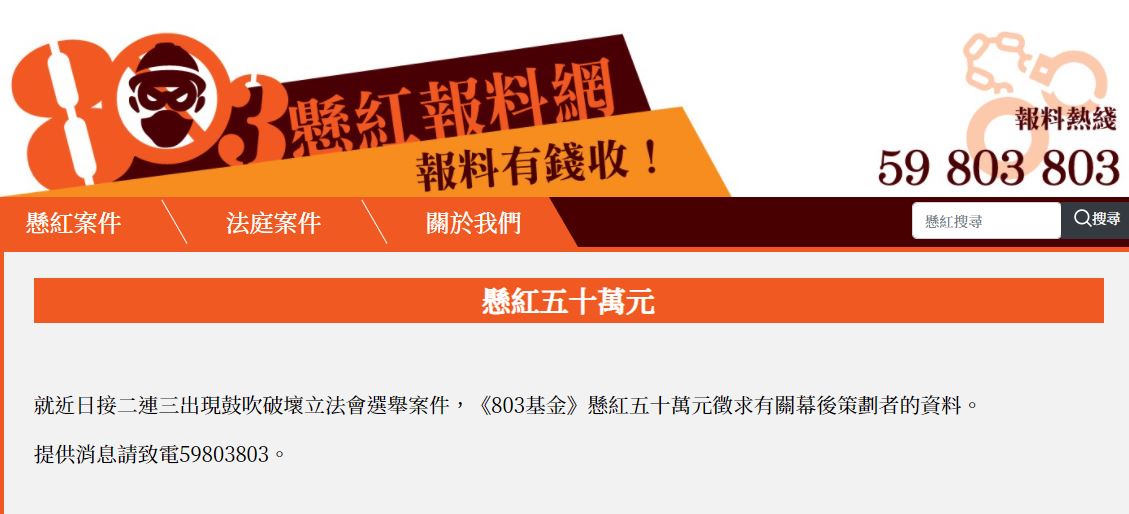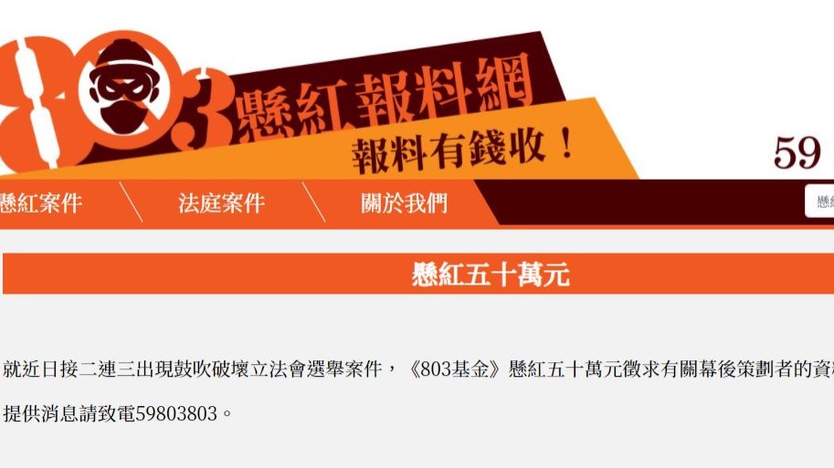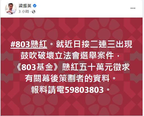 全國政協副主席、前香港特首梁振英今日(17日)在社交平台發文表示,由其創辦的「803基金」宣布,就近日接二連三出現鼓吹破壞立法會選舉案件,「803基金」懸紅50萬元徵求有關幕後策劃者的資料。報料請電59803803。