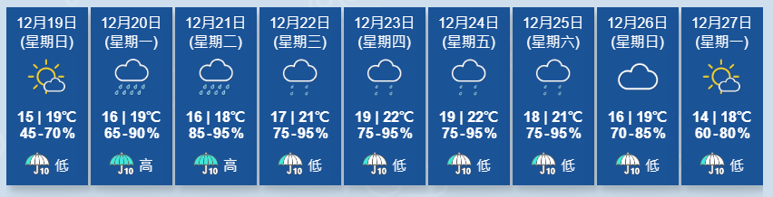 預測本港今晚大致多雲,天氣乾燥。明天(19日)早上清涼,市區最低氣溫約15度,新界再低兩三度。日間大致天晴,稍後漸轉多雲。最高氣溫約19度。吹和緩至清勁北至東北風,明日離岸及高地間中吹強風。展望星期一(20日)、星期二(21日)多雲有雨,風勢頗大,早上清涼。下周中期仍有一兩陣雨。