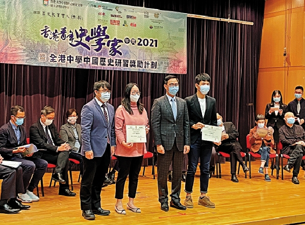 【大公報記者 葉心弦(文、圖)】「香港青年史學家年獎」暨「全港中學中國歷史研習獎勵計劃」頒獎禮2021昨日在香港大學校園舉行,主禮嘉賓包括教育局局長楊潤雄、香港大學校長張翔,以及香港大學中國歷史研究文學碩士同學會會長何漢權。莘莘學子齊聚一堂共享慶典,聆聽前輩學者的諄諄教導,並與其他獲獎同學一起交流心得和體會。三位學生獲頒「香港青年史學家年獎」,其中兩人已分別升讀北京大學和清華大學,並就讀歷史相關專業,他們不會滿足書本上的歷史,希望透過進一步的研習,更深入追求相關知識,傳承中國文化。
