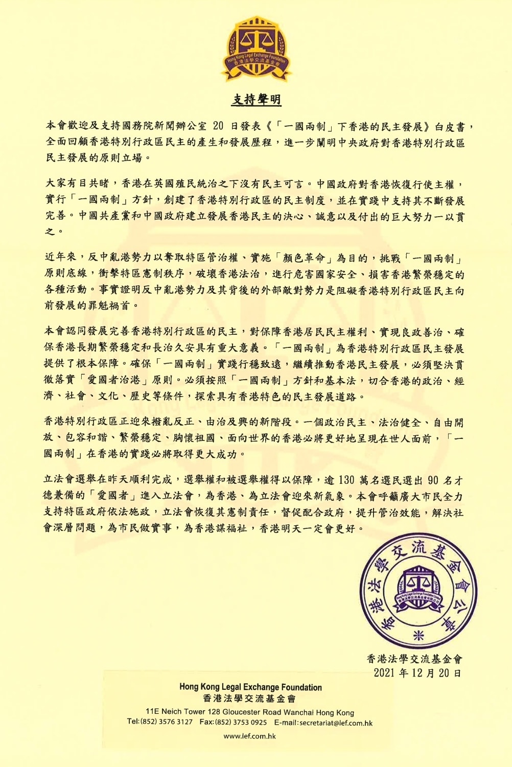 基金會認同發展完善香港特別行政區的民主,對保障香港居民民主權利、實現良政善治、確保香港長期繁榮穩定和長治久安具有重大意義。「一國兩制」為香港特別行政區民主發展提供了根本保障。確保「一國兩制」實踐行穩致遠,繼續推動香港民主發展,必須堅決貫徹落實「愛國者治港」原則。必須按照「一國兩制」方針和基本法,切合香港的政治、經濟、社會、文化、歷史等條件,探索具有香港特色的民主發展道路。