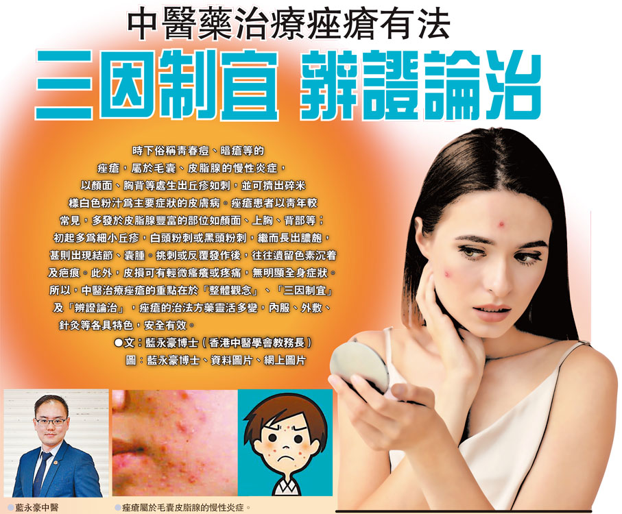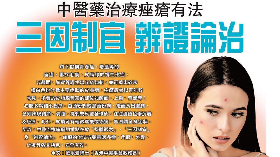 時下俗稱青春痘、暗瘡等的痤瘡,屬於毛囊、皮脂腺的慢性炎症,以顏面、胸背等處生出丘疹如刺,並可擠出碎米樣白色粉汁為主要症狀的皮膚病。痤瘡患者以青年較常見,多發於皮脂腺豐富的部位如顏面、上胸、背部等;初起多為細小丘疹,白頭粉刺或黑頭粉刺,繼而長出膿皰,甚則出現結節、囊腫。挑刺或反覆發作後,往往遺留色素沉着及疤痕。此外,皮損可有輕微瘙癢或疼痛,無明顯全身症狀。所以,中醫治療痤瘡的重點在於「整體觀念」、「三因制宜」及「辨證論治」,痤瘡的治法方藥靈活多變,內服、外敷、針灸等各具特色,安全有效。