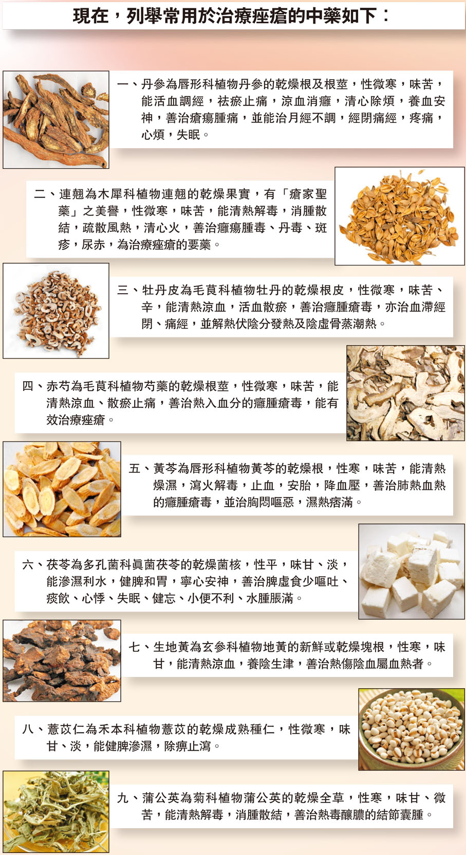 比如說,丹梔逍遙散出自《內科摘要》,藥用牡丹皮、山梔、當歸、芍藥、茯苓、白朮、柴胡和炙甘草,能養血健脾,疏肝清熱,常用於肝鬱血虛,內有鬱熱證的痤瘡患者;又例如龍膽瀉肝湯出自《醫方集解》,藥用龍膽、黃芩、梔子、澤瀉、木通、車前子、當歸、生地黃、柴胡、甘草,能清洩肝膽實火,清利肝經濕熱,對肝膽實火上炎證或肝經濕熱下注證痤瘡患者尤其有效;知柏地黃丸出自《醫方考》,即六味地黃丸(熟地黃、山萸肉、乾山藥、澤瀉、牡丹皮、茯苓)加知母、黃柏,能滋陰降火,常用於肝腎陰虛,虛火上炎的痤瘡患者;五味消毒飲《醫宗金鑒》藥用金銀花、野菊花、蒲公英、紫花地丁、紫背天葵子,能清熱解毒,消散疔瘡,對熱毒內蘊的痤瘡患者尤為適宜;黃連解毒湯出自《肘後備急方》,藥用黃連、黃芩、黃柏、梔子,能瀉火解毒,有效針對三焦火毒為特點的痤瘡患者。