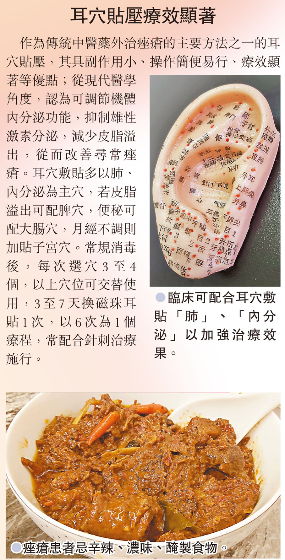 作為傳統中醫藥外治痤瘡的主要方法之一的耳穴貼壓,其具副作用小、操作簡便易行、療效顯著等優點;從現代醫學角度,認為可調節機體內分泌功能,抑制雄性激素分泌,減少皮脂溢出,從而改善尋常痤瘡。耳穴敷貼多以肺、內分泌為主穴,若皮脂溢出可配脾穴,便秘可配大腸穴,月經不調則加貼子宮穴。常規消毒後,每次選穴3至4個,以上穴位可交替使用,3至7天換磁珠耳貼1次,以6次為1個療程,常配合針刺治療施行。