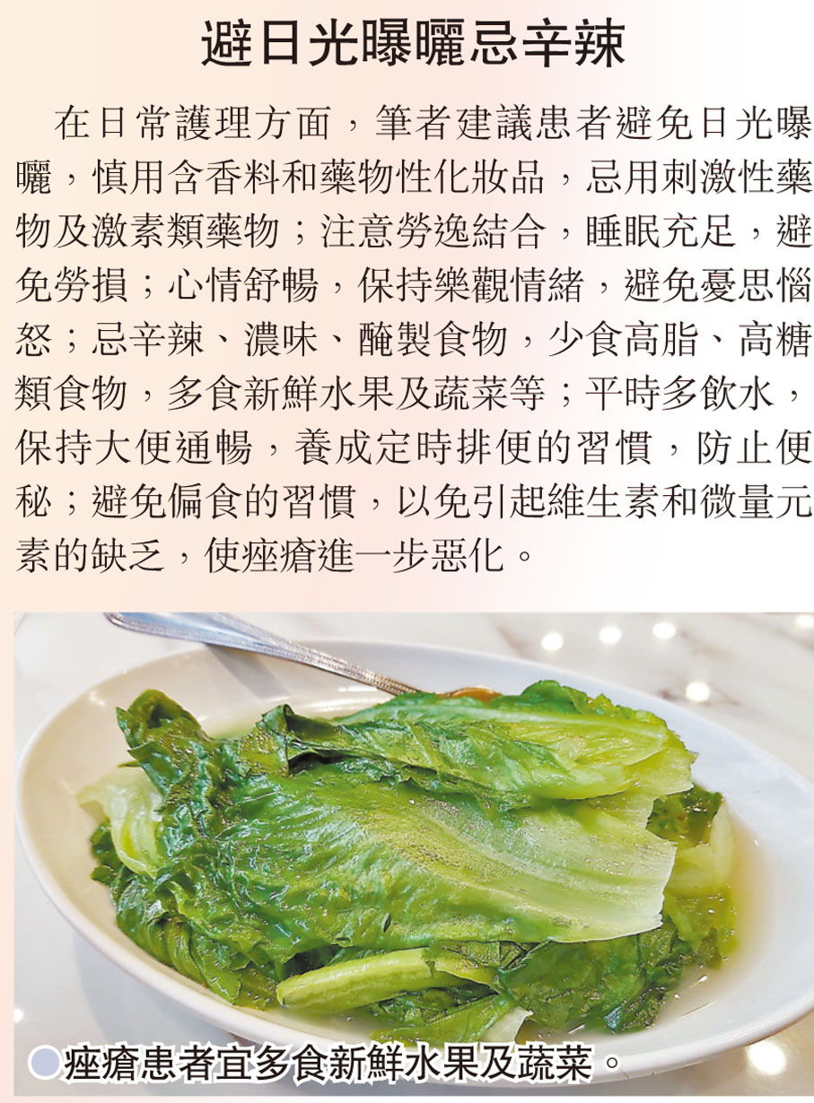 在日常護理方面,筆者建議患者避免日光曝曬,慎用含香料和藥物性化妝品,忌用刺激性藥物及激素類藥物;注意勞逸結合,睡眠充足,避免勞損;心情舒暢,保持樂觀情緒,避免憂思惱怒;忌辛辣、濃味、醃製食物,少食高脂、高糖類食物,多食新鮮水果及蔬菜等;平時多飲水,保持大便通暢,養成定時排便的習慣,防止便秘;避免偏食的習慣,以免引起維生素和微量元素的缺乏,使痤瘡進一步惡化。