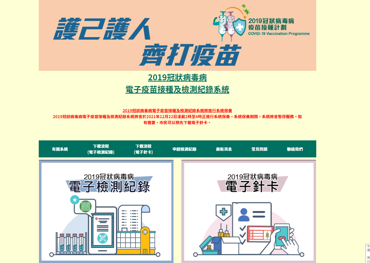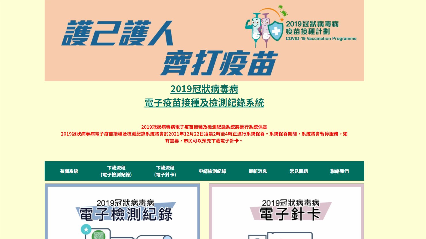 大公文匯全媒體報道,政府今日(21日)宣布,新冠病毒疫苗接種記錄系統明日(22日)凌晨2時至4時進行系統保養,將於該時段內暫停提供服務。