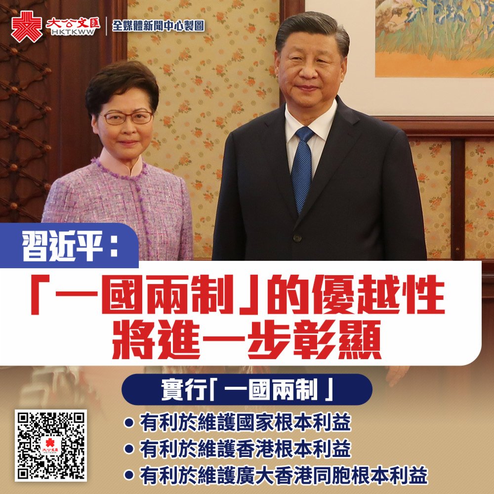 習近平強調,今年是中國共產黨成立100周年。黨的十九屆六中全會作出關於黨的百年奮鬥重大成就和歷史經驗的決議,「一國兩制」作為重要內容寫入其中。香港回歸祖國20多年不平凡的歷程充分證明,實行「一國兩制」,有利於維護國家根本利益,有利於維護香港根本利益,有利於維護廣大香港同胞根本利益。中央將繼續堅定不移貫徹「一國兩制」方針。我們堅信,隨着實踐不斷深入和制度體系不斷完善,「一國兩制」的優越性將進一步彰顯。廣大香港同胞一定能弘揚愛國愛港的光榮傳統,同全國各族人民攜手並肩,為實現中華民族偉大復興共同奮鬥。