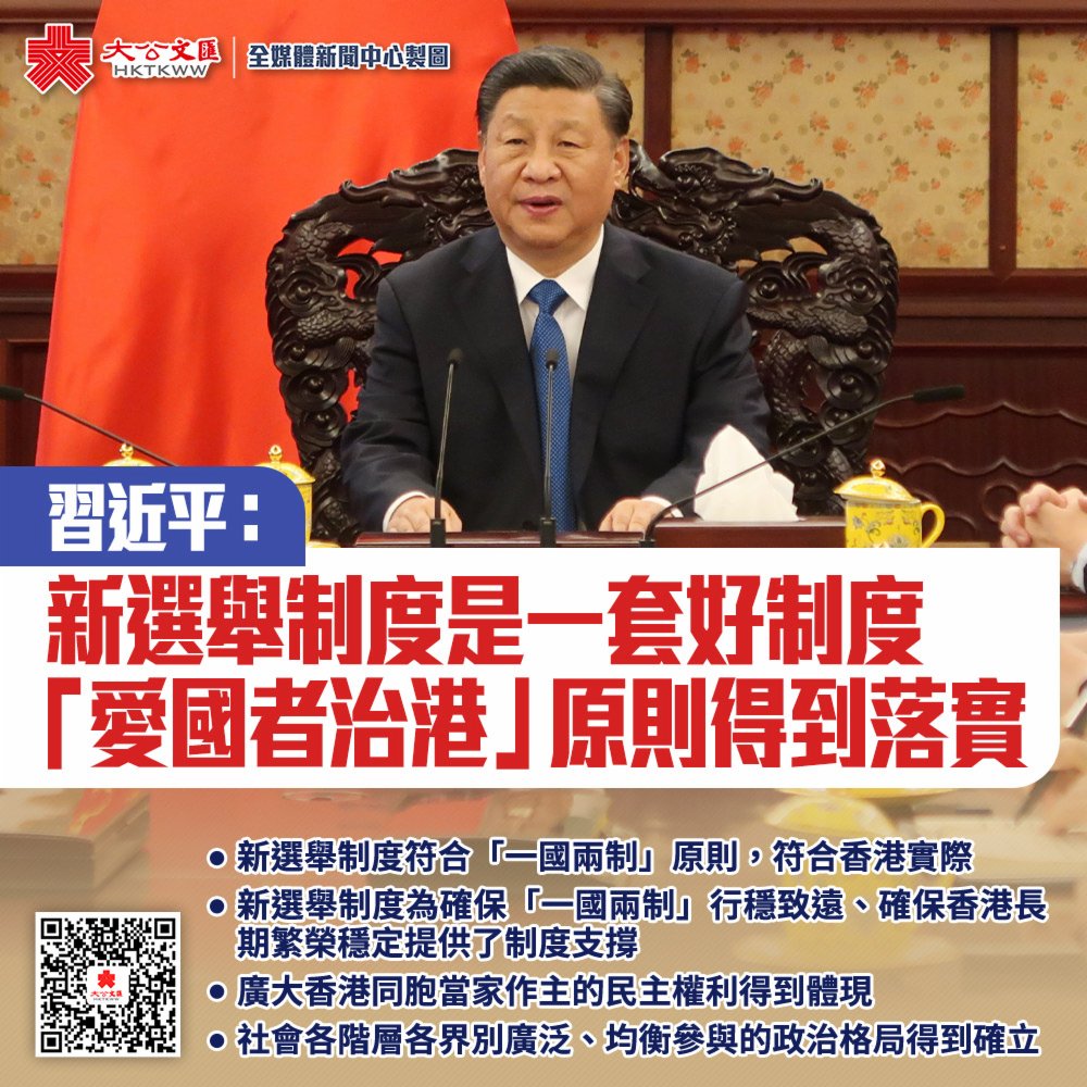 習近平指出,幾天前,香港舉行了第七屆立法會選舉。在新選舉制度下,香港特別行政區選舉委員會選舉和第七屆立法會選舉先後舉行,都取得了成功。廣大香港同胞當家作主的民主權利得到體現,「愛國者治港」原則得到落實,社會各階層各界別廣泛、均衡參與的政治格局得到確立。實踐證明,新選舉制度符合「一國兩制」原則,符合香港實際,為確保「一國兩制」行穩致遠、確保香港長期繁榮穩定提供了制度支撐,是一套好制度。