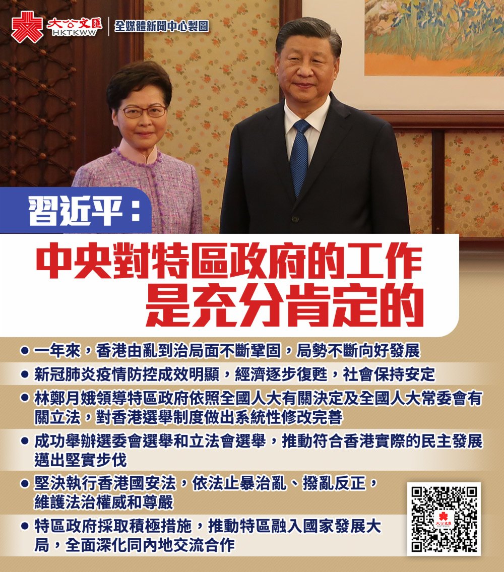 習近平指出,一年來,香港由亂到治的局面不斷鞏固,局勢不斷向好發展。新冠肺炎疫情防控成效明顯,經濟逐步復甦,社會保持安定。林鄭月娥行政長官領導特別行政區政府,依照全國人大有關決定和全國人大常委會有關立法,對香港選舉制度作出系統性修改完善;成功舉辦選舉委員會選舉和立法會選舉,推動符合香港實際的民主發展邁出堅實步伐;堅決執行香港國安法,依法止暴制亂、撥亂反正,維護法治的權威和尊嚴;採取積極措施,推動特別行政區融入國家發展大局,全面深化同內地交流合作。中央對林鄭月娥行政長官和特別行政區政府的工作是充分肯定的。