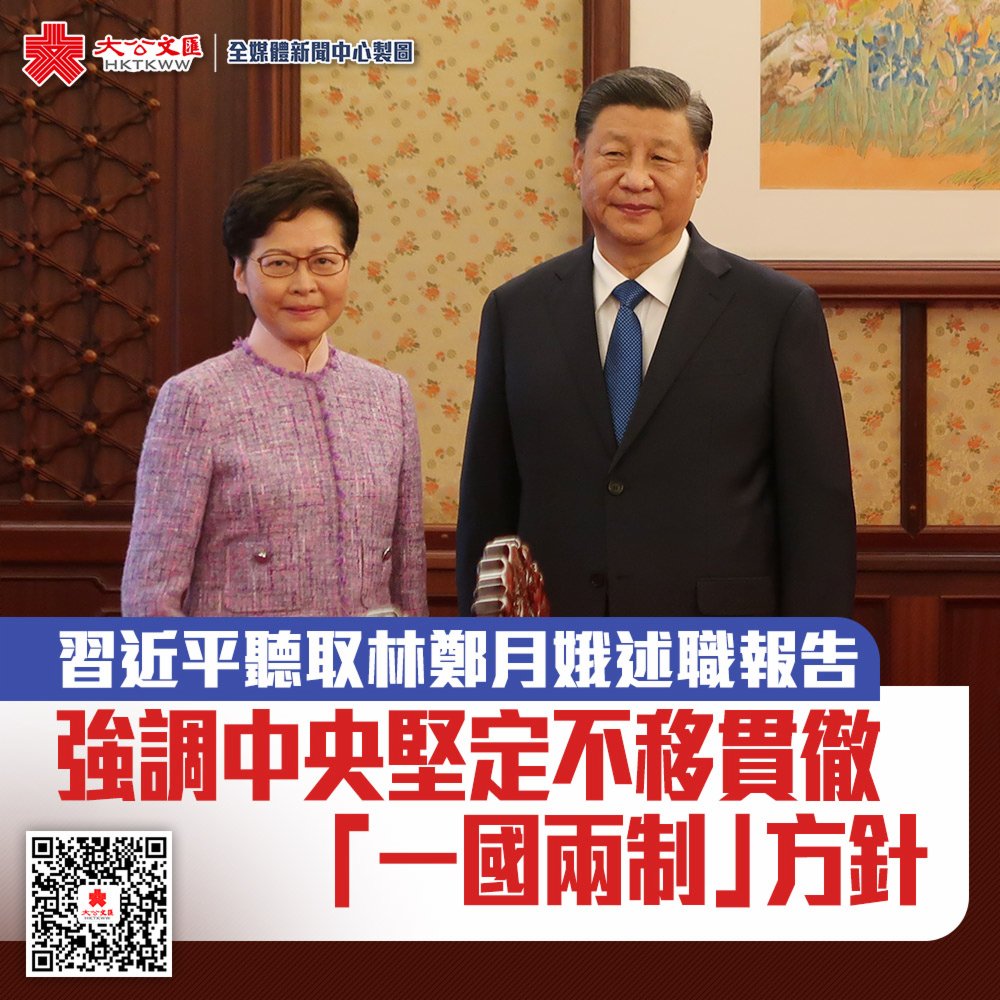 綜合新華社及大公文匯全媒體記者馬靜報道,國家主席習近平22日下午在中南海瀛台會見來京述職的香港特別行政區行政長官林鄭月娥,聽取她對香港當前形勢和特別行政區政府工作情況的匯報。