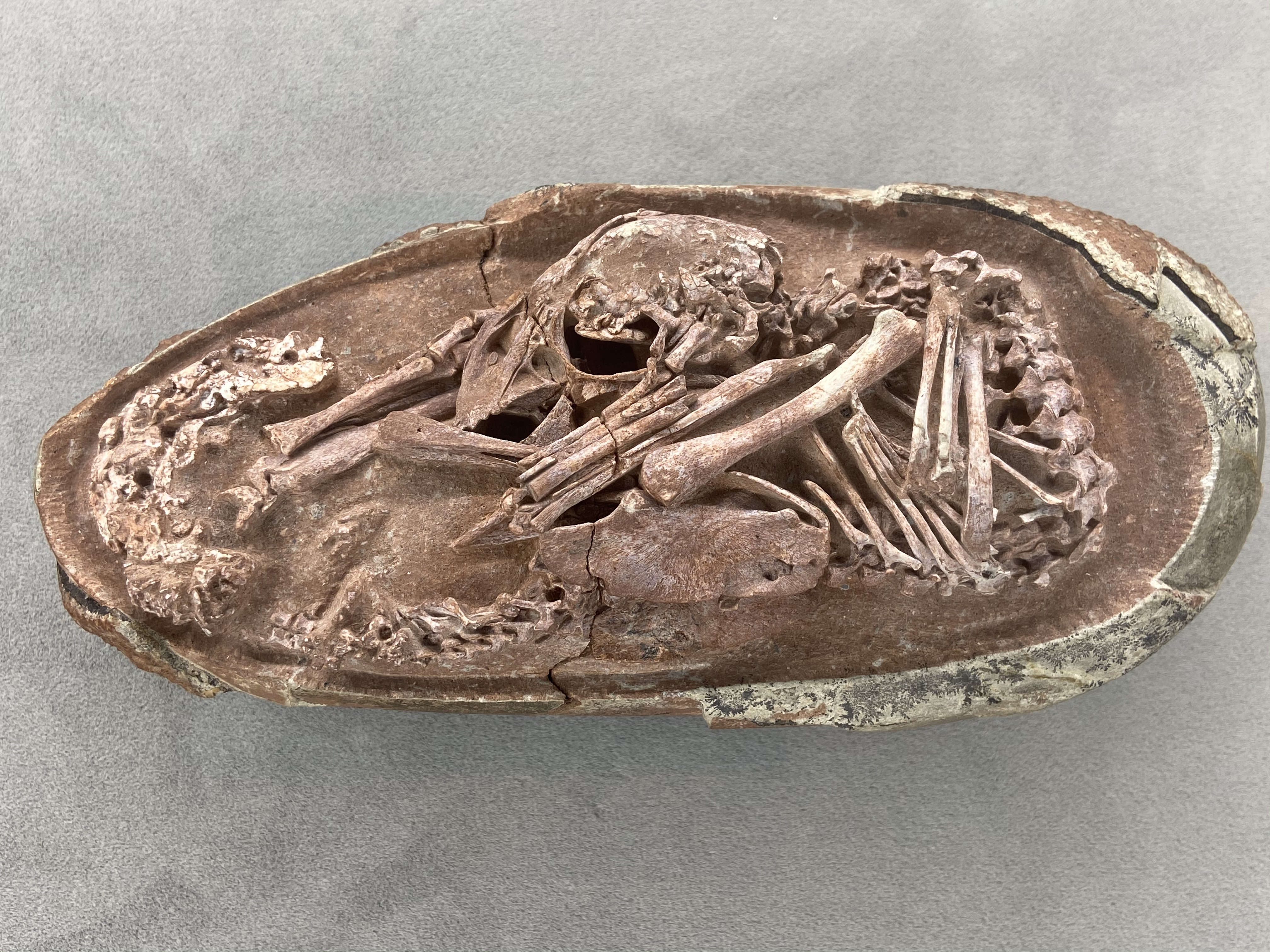 (大公文匯網 記者 蘇榕蓉)未孵化完的「恐龍寶寶」長什麼樣?今天(22日),在福建省科技館裏,一枚名叫「英良貝貝」的恐龍胚胎為我們揭開神秘面紗。在一塊有着7200萬年至6600萬年歷史的化石裏,蜷曲着一枚恐龍胚胎,姿勢與現代鳥類的胚胎類似,從頭到尾總長度估計為27厘米。研究團隊認為,這個胚胎化石屬於一隻沒有牙齒的獸腳類恐龍,是迄今為止科學記錄的最完整的恐龍胚胎。這項研究在今天(22日)發表在《iScience》雜誌上。這一重大科學發現,對恐龍的生長與發育繁殖提供了全新的重要科學認知。