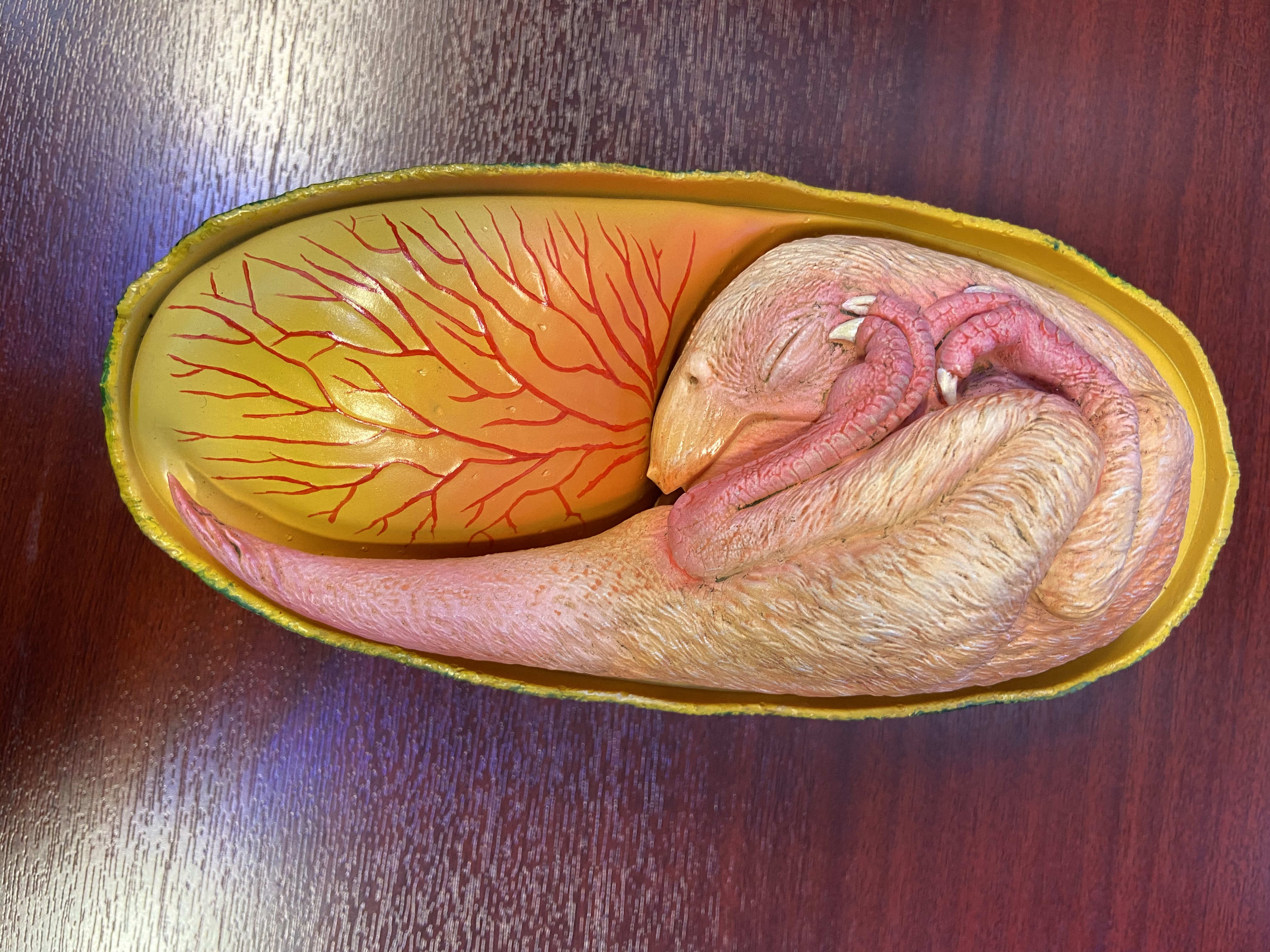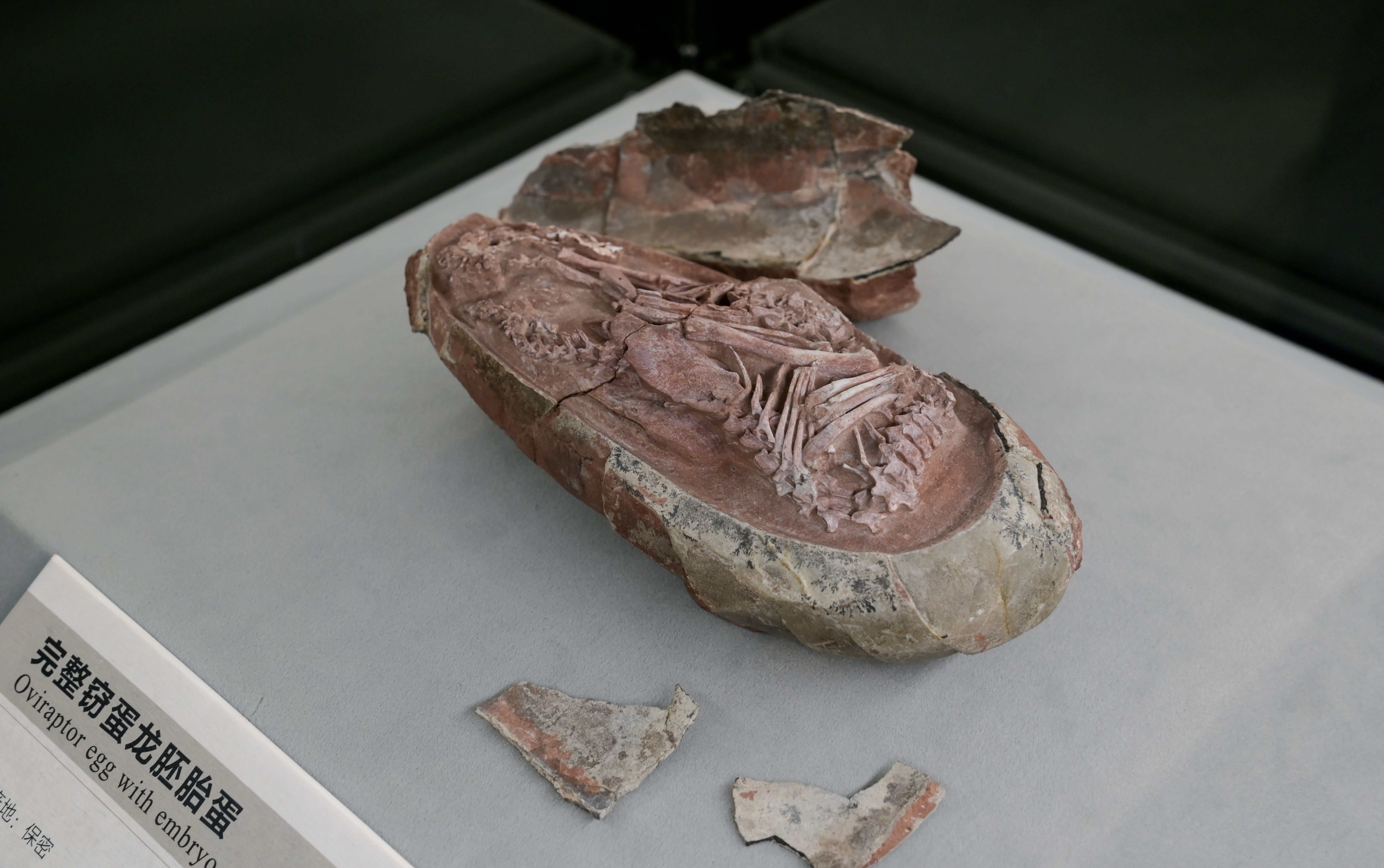大公文匯網記者在福建省科技館看到,這個恐龍胚胎從頭到尾總長度估計為27厘米,蜷曲在一個長度為17厘米長形蛋化石中。恐龍胚胎頭部位於身體下方,腳在兩側,身體背部沿着蛋的鈍端蜷縮着,姿勢類似與現代鳥類胚胎類似,清晰展現了其存活時的狀態。