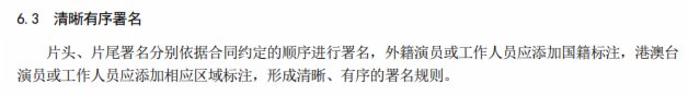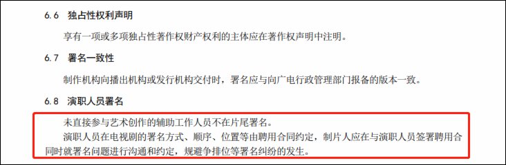 關於演職人員署名,《電視劇母版製作規範(報批稿)》規定,未直接參與藝術創作的輔助工作人員不在片尾署名。演職人員在電視劇的署名方式、順序、位置等由聘用合同約定,製片人應在與演職人員簽署聘用合同時就署名問題進行溝通和約定,規避爭排位等署名糾紛的發生。