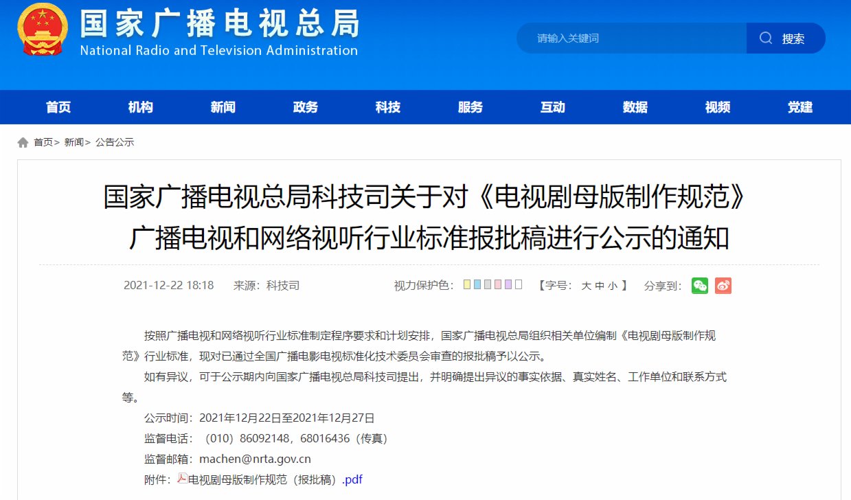 據國家廣電總局網站12月22日消息,按照廣播電視和網絡視聽行業標準制定程序要求和計劃安排,國家廣播電視總局組織相關單位編製《電視劇母版製作規範》行業標準,現對已通過全國廣播電影電視標準化技術委員會審查的報批稿予以公示。公示時間為2021年12月22日至2021年12月27日。