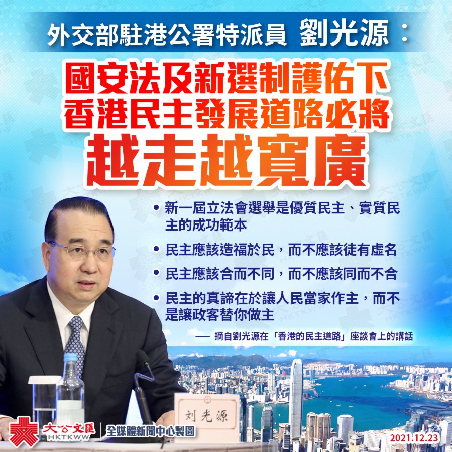 大公文匯全媒體報道,香港中聯辦今日(23日)於會議展覽中心舉行「香港的民主道路」座談會。外交部駐港公署特派員劉光源在會上表示,在中央政府的堅定支持下,在香港國安法和新選舉制度的護佑下,在廣大香港同胞齊心協力下,香港的民主發展道路必將越走越寬廣,香港的「一國兩制」必將更加行穩致遠。