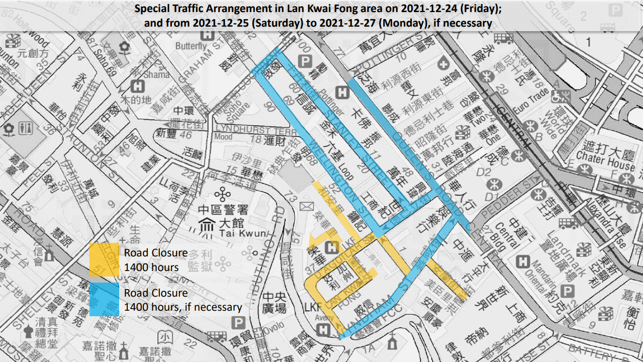 警方指出,12月24日下午2時至12月25日上午5時,介乎雲咸街與威靈頓街的德己立街、蘭桂坊、榮華里、和安里、介乎雲咸街與德己立街的威靈頓街、安蘭街將封閉;視乎人潮情況,介乎德己立街與閣麟街的士丹利街、介乎己連拿利與皇后大道中的雲咸街、介乎皇后大道中與威靈頓街的德己立街、介乎德己立街與閣麟街的威靈頓街、介乎威靈頓街與士丹利街的閣麟街、擺花街、介乎畢打街與砵典乍街的皇后大道中或會封閉;在交通改道措施完成後,警方將指示人群沿皇后大道中、德己立街、士丹利街、閣麟街及威靈頓街輪候,整條德己立街將會禁止車輛駛入。