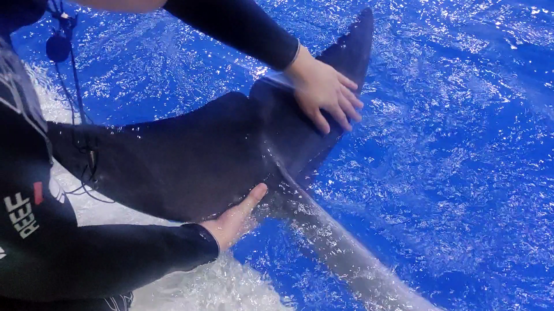 在與海豚相處的過程中,如何讓海豚保持愉悅的心情,是吳非凡的必修課之一。其中,為海豚搓澡則是一件辛苦但也樂趣頗多的工作。「很多人不知道海豚其實也是需要搓澡的,因為牠們身上經常有一些死皮,這些是通過新陳代謝形成的,所以我經常給牠搓澡。」吳非凡一邊演示一邊說道,「像尾鰭這邊的死皮就特別多。」吳非凡每天還會給「芭比」進行一次體檢,這項工作也會在搓澡中進行,「邊擦邊進行體檢,如果摸牠的額隆,牠也會發出特別舒服的叫聲。」
