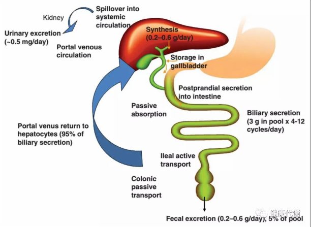 肝臟以膽固醇為原料合成膽汁酸,膽汁酸是膽汁的重要組成成分。肝臟分泌的膽汁經膽囊排至腸道,負責乳化脂肪,促進脂質和脂溶性維生素的消化吸收。膽汁酸在肝臟中的合成量很少,正常人體的肝臟膽汁酸池僅為3-5克。95%以上的膽汁酸通過肝腸迴圈(enterohepatic circulation)可以被腸道重新吸收,並通過血液回到肝臟,與新合成的膽汁酸再次排進腸道,滿足人們身體的代謝需求。