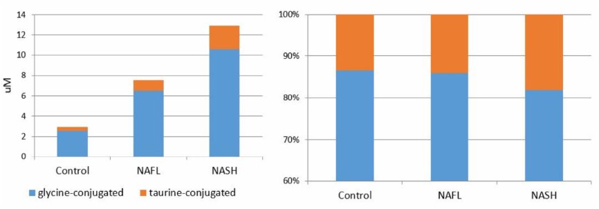 其中,GCA/TCA和GDCA/TDCA可用於從健康人群中識別早期慢性肝病(NAFL和NASH)或區分早期和晚期慢性肝病(肝纖維化、肝癌);GCDCA/TCDCA可作為早期和晚期慢性肝病的指標。