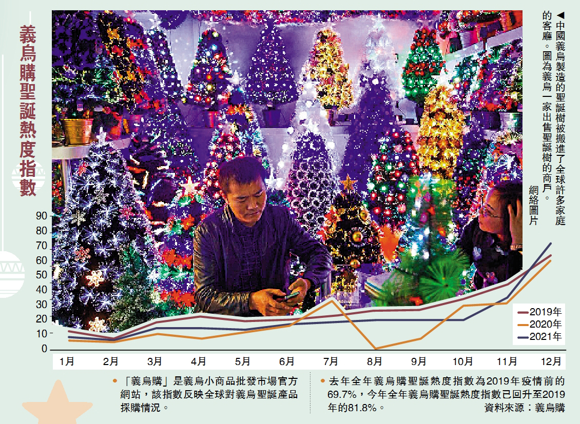 【大公報記者 王莉】聖誕節來臨,作為節日必不可少的聖誕樹也從它的「家鄉」中國義烏被搬進了全球許多家庭的客廳。平安夜一則《全球92%的聖誕樹中國造》的消息引起內地網民熱議,有數據顯示,全球92%的聖誕樹都來自於中國製造,此外包括聖誕裝飾品、聖誕玩具、聖誕禮品等都從網上下單,義烏發貨;即使面對國際海運不暢通的情況,亦不阻外商訂單的紛至沓來,塞爆義烏商家郵箱。這個浙江小縣城雖沒有慶祝聖誕節的傳統,卻憑藉強勁的出口,支撐起了全球數十億人的聖誕夢想。