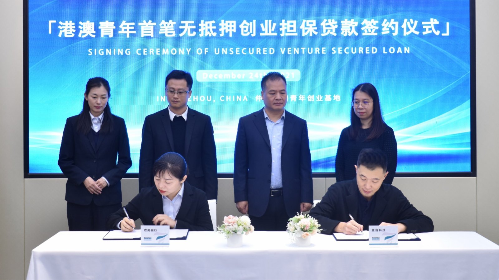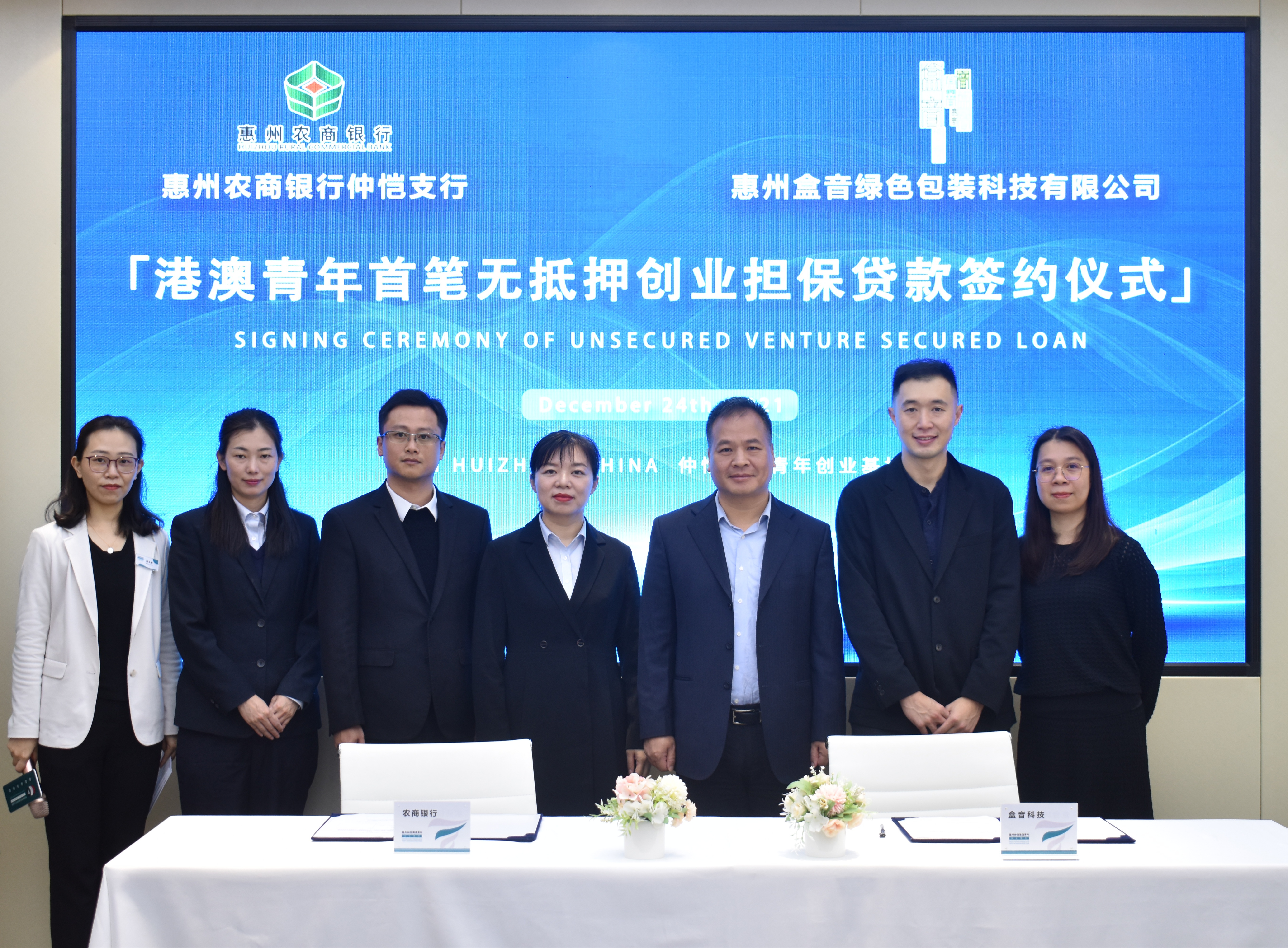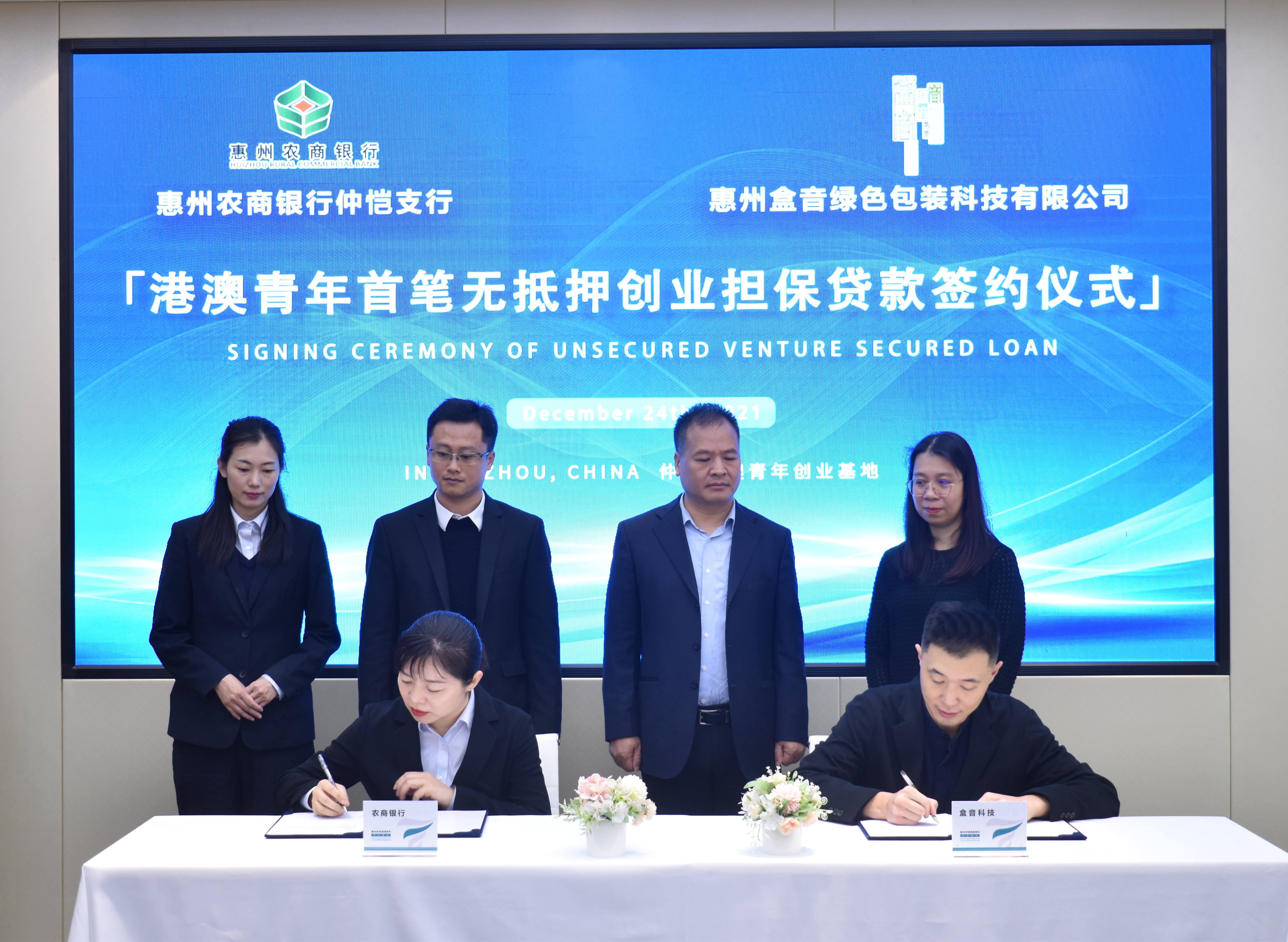 (大公文匯網記者 帥誠)日前,港澳青年首筆無抵押創業擔保貸款在惠州仲愷港澳青年創業基地成功簽約。惠州仲愷高新區社會事務局黨組成員、副局長譚洪州、惠州農村商業銀行股份有限公司仲愷支行副行長吳靜、區人才交流與勞動就業服務中心及農商行仲愷支行代表以及香港青年王柏東出席簽約儀式。