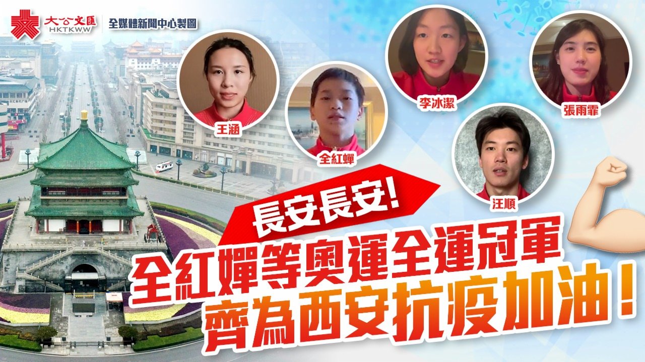 大公文匯全媒體記者李陽波西安報道:西安疫情牽動着全國人民的心。連日來,曾在今年9月於西安舉行的第十四屆全國運動會上獲得冠軍的全紅嬋、汪順、張雨霏、王涵、李冰潔,紛紛以視頻的形式,為西安抗疫加油,為西安市民加油。