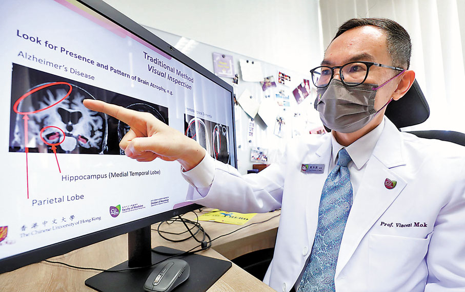 阿茲海默症患者的大腦變化緩慢,哪怕是經驗老到的醫生,也難單憑大腦的磁力共振(MRI)影像辨識早期患者。香港中文大學周佩芳認知障礙預防研究中心主任、醫學院內科及藥物治療學系腦神經科主任(學術事務)莫仲棠及其團隊遂積極研究人工智能結合磁力共振的全新技術,以辨認大腦「容量」的變化及萎縮情況,在10分鐘內得出直觀可靠的「阿茲海默症腦萎縮指數(AD-RAI)」,協助醫生斷症。