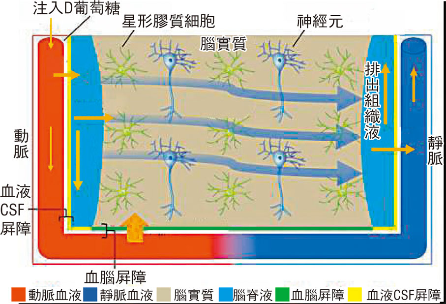 葡萄糖作為大腦的主要能源,測量它在大腦的蹤跡,即可了解「清除」過程有否受到阻礙,故陳葦恩團隊研發的「動態葡萄糖增強磁力共振分子成像」(DGE-MRI),原理是來自動脈的葡萄糖通過血管周邊的葡萄糖運轉蛋白進入腦實質,通過「血液腦脊液屏障」及「血腦屏障」後,大部分腦脊液會循環至腦實質,最後排出組織液。新型DGE-MRI能同時檢測腦實質、脊髓液的圖像,還能提供血腦屏障通透性訊息,測量葡萄糖的攝取及清除過程,意味着在β澱粉樣蛋白形成前,已經能捕捉大腦變化。