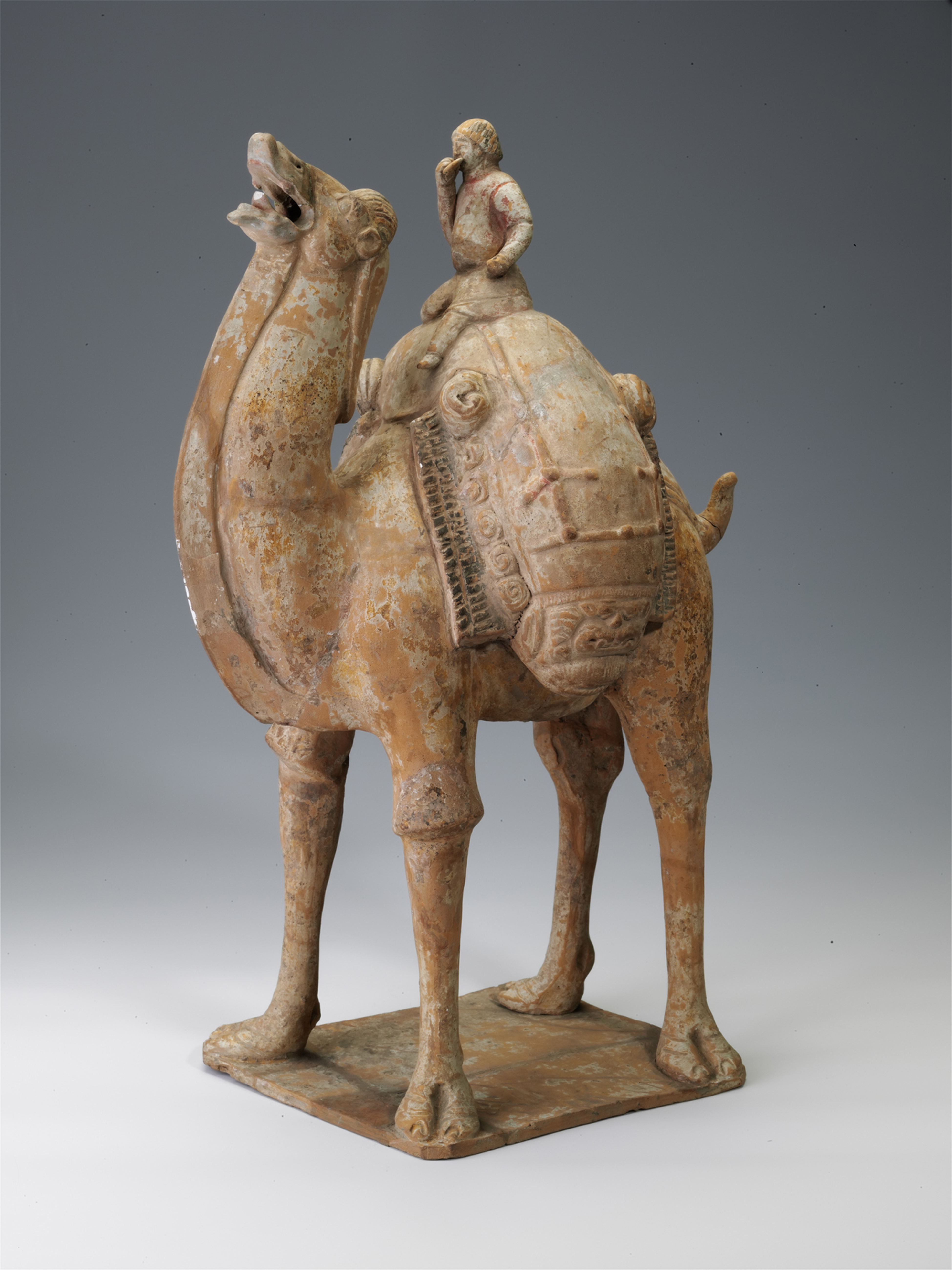 「隋彩繪駱駝俑」是山西博物院館藏文物,其高45.7厘米,由太原市沙溝村斛律徹墓出土。墓葬的主人斛律徹,曾任北齊假黃鉞、使持節、相國、朔州刺史等官職。該墓葬中,陶俑的數量很多,有儀仗俑、女侍俑、伎樂騎俑、武士俑等,顯示了墓主人生前的一些生活場景。其中,出土的騎駱駝俑有2件,現場亮相的這件非常精美,造型生動。駱駝昂首站立在長方形的托板上,雙峰間墊着毯子,馱着絲絹、皮囊等物品,皮囊上坐着一人,濃濃的眉毛、深目高鼻,頭上戴着圓氈帽。有趣的是他的手裏還抓着一個餅,正邊走邊吃着。這件文物的亮點是坐在駱駝上的胡商手裏的餅子,原本名為「饢」,是一種可以存放很久的食物,傳入中國後,被稱為「胡餅」。駱駝被譽為「沙漠之舟」,是最易於在沙漠上行走和運輸的動物,駱駝背上所馱的貨物,應該是當時貿易往來中的大宗商品。