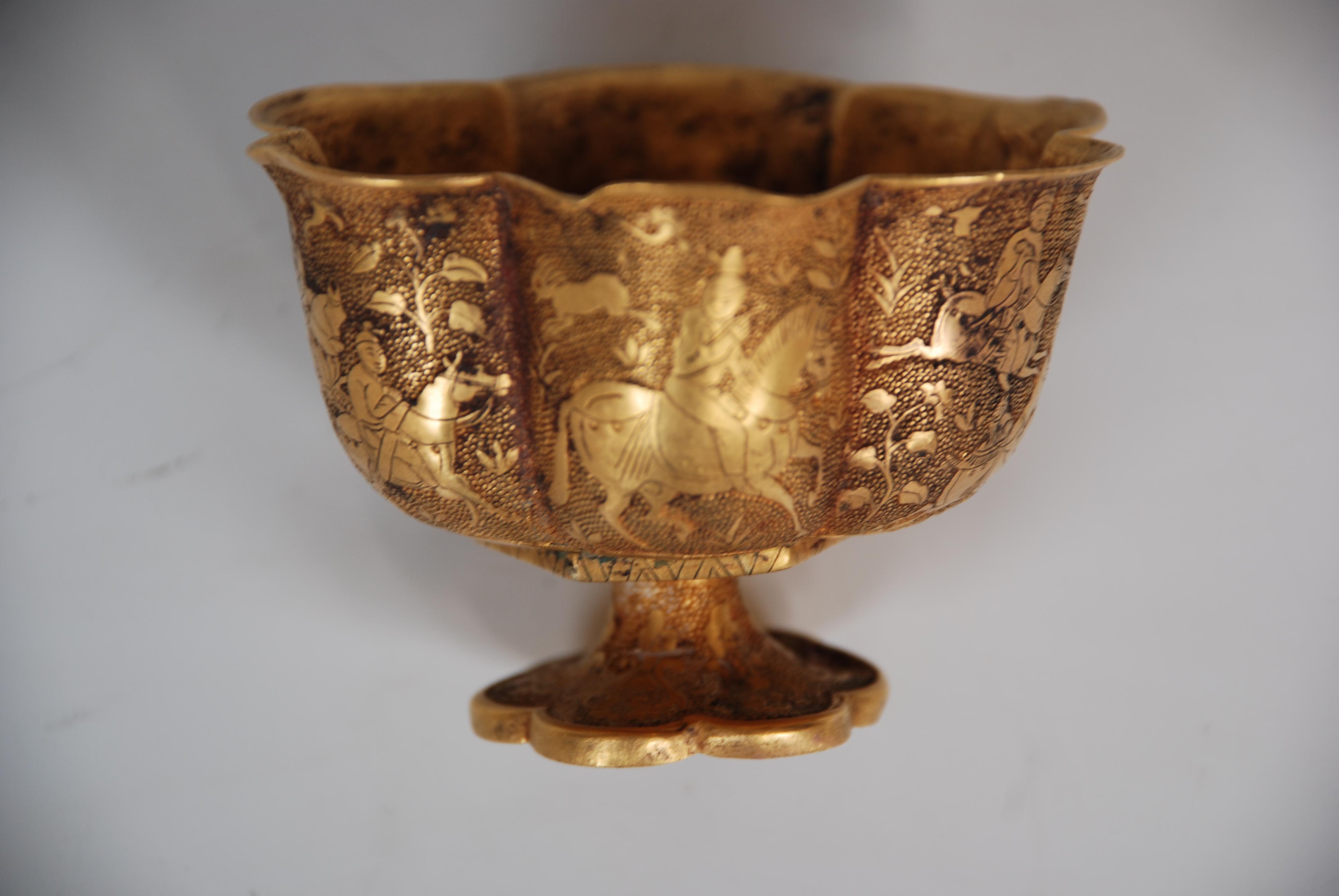 第三件是「唐六曲花卉紋金杯」,通高5.4厘米、口徑7.9厘米、底徑3.5厘米。2004年,由山西省公安機關移交山西博物院。