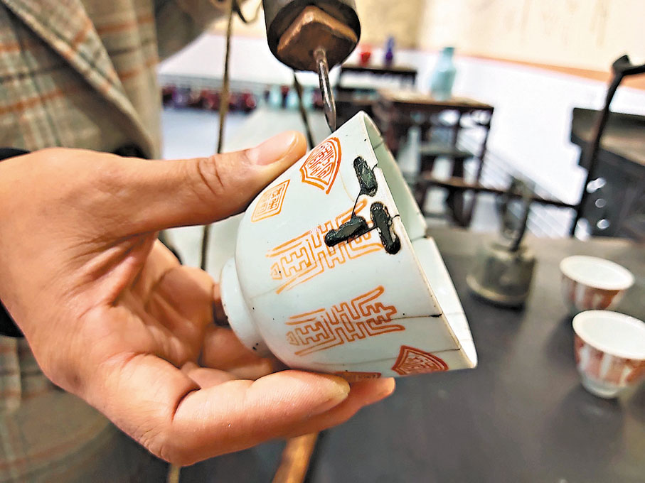 「金鑲玉」技藝,顧名思義,是將金屬鑲嵌在陶器、瓷器、玉器、紫砂等器物上面,一是對破損的器皿進行修補,二是起到裝飾的作用。「相當於給器皿打上精美的『補丁』,在古代和幾十年前物質匱乏的時代,器皿出現破損沒錢換新的,對家裏的水缸或者瓶瓶罐罐進行修補是常有的事。」河南郟縣「金鑲玉」技藝國家級非遺傳承人李冰表示。