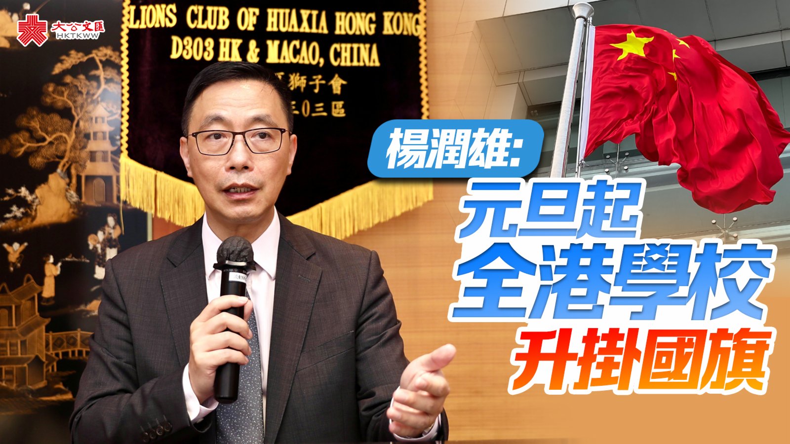 大公文匯全媒體報道,教育局局長楊潤雄今日(29日)在社交平台撰文表示,由2022年元旦日起,全港學校均會升掛國旗,為新一年揭開序幕,也為校園帶來新氣象,他祝願各位校長、老師和同學新年進步。楊潤雄指,工欲善其事,必先利其器,全港絕大部分學校已設有固定旗杆,但先前仍有少數學校尚未裝設旗杆或設有旗杆但位置並不理想,有待改善。為此,教育局自8月起已專事專辦,陸續為20多所公營學校加裝旗杆,以照顧有關學校的需要。