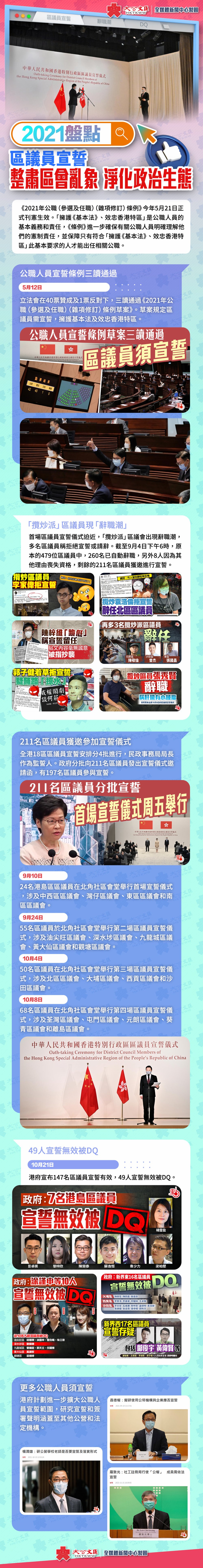 大公文匯全媒體報道,自2019年「攬炒派」趁黑暴之亂拿下300多個區議會議席、把持大部分區議會的控制權後,議會亂象從此頻生,「攬炒派」議員阻撓民生撥款、散布仇恨言論、攻擊政府官員,區議會功能失效。《2021年公職(參選及任職)(雜項修訂)條例》今年5月21日正式刊憲生效,要求區議員必須宣誓,擁護基本法及效忠香港特區。撥亂反正、正本清源,區會亂象得以終結。