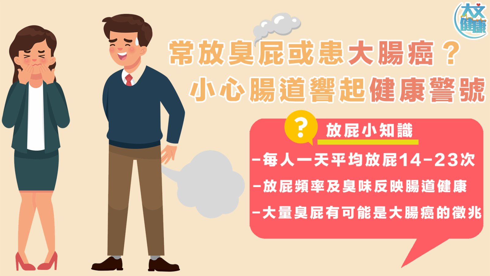 值得注意的是,大量的臭屁亦有可能是大腸癌的徵兆之一,這是因為臭屁出現的原因可能是由於大腸癌細胞或息肉的出現導致腸道受到阻塞,使氣體堆積在腸道中。因此,如果改變飲食習慣,或用藥都無法改善臭屁的情況,應盡快就醫接受檢查,以排除癌症可能性或及時接受治療。