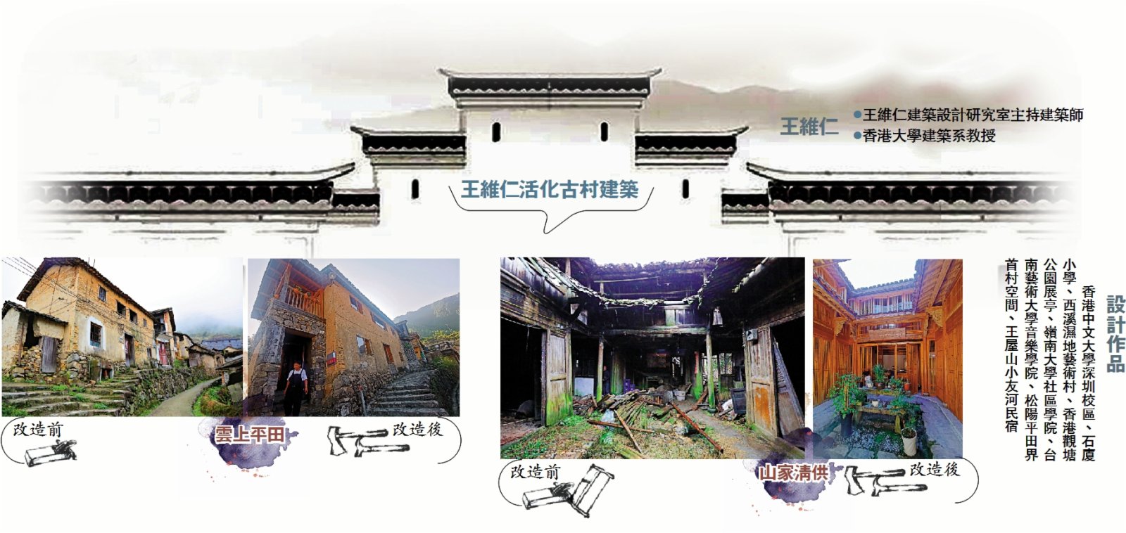 (大公報記者 茅建興)在中國「鄉村振興戰略」、「共同富裕」持續推進的大背景下,鄉村為建築師們提供了一個新的龐大創作舞台。香港大學建築系教授王維仁,2015年以來利用周末時光,從香港飛到千里之外的浙江松陽縣古村落,改造活化了當地上百年的古村建築,如今這裏已被中國國家地理雜誌譽為「江南最後的秘境」,成為網紅旅遊打卡點。「雖然舟車勞累,但我卻樂此不疲,因為這裏是我多年來對傳統與現代空間以及城鄉建築探索實踐的地方,也讓我對村子周邊大山溪流與樹林田野產生了深厚的感情。」王維仁說。