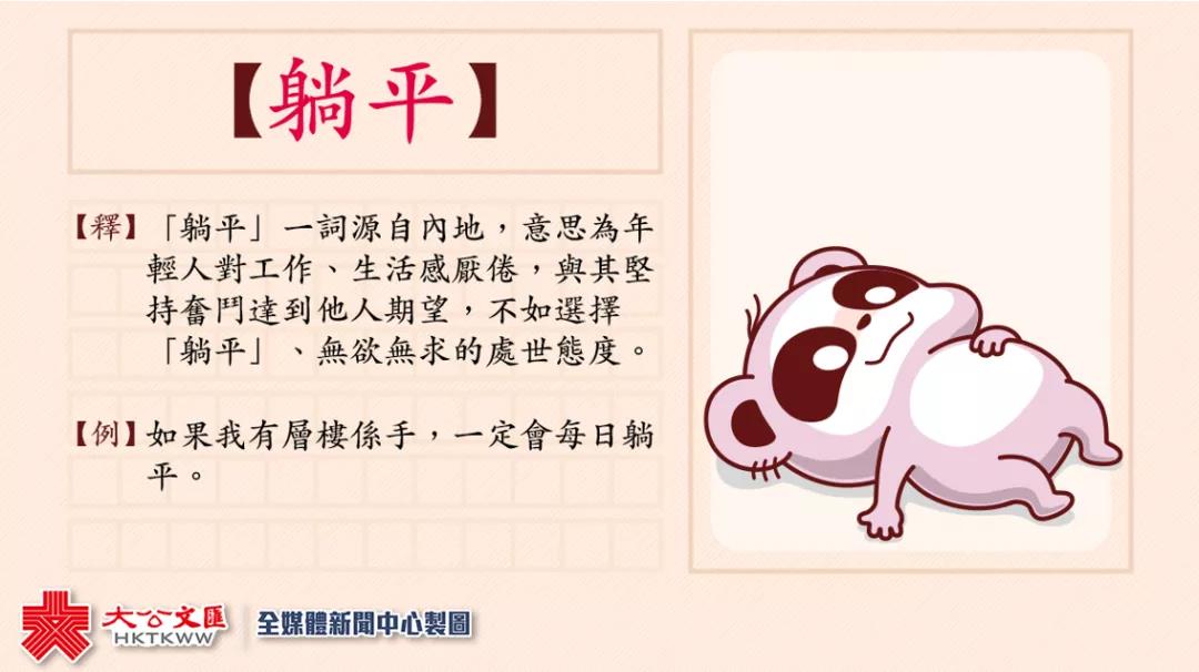 【躺平】:「躺平」登2021年度潮語榜首,成為年輕人最常用的潮語,「躺平」一詞源自內地,意思為年輕人對工作、生活感厭倦,與其堅持奮鬥達到他人期望,不如選擇「躺平」、無欲無求的處世態度。