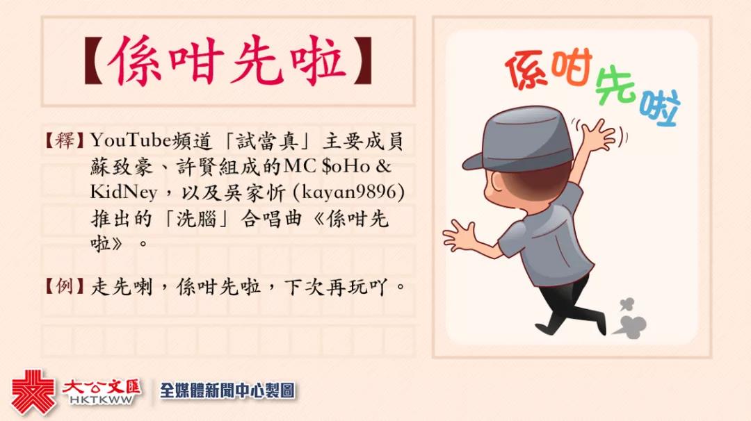 這是源於YouTube頻道「試當真」合唱曲《係咁先啦》,一推出就火爆全網,不少朋友離別時,都會以特別節奏唱出「走先喇,係咁先啦,下次再玩吖!」