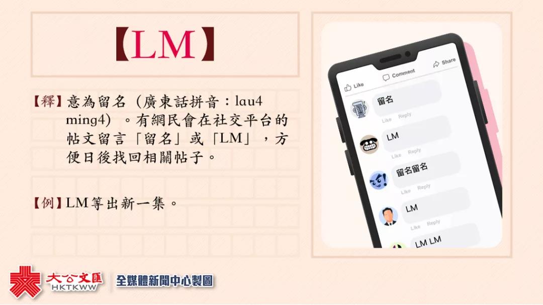 【LM】:「LM」即「留名」(廣東話拼音:lau4 ming4),常見於討論區或者團購WhatsApp群組,如果想參與團購,見到「LM」,記得寫低自己的名字!