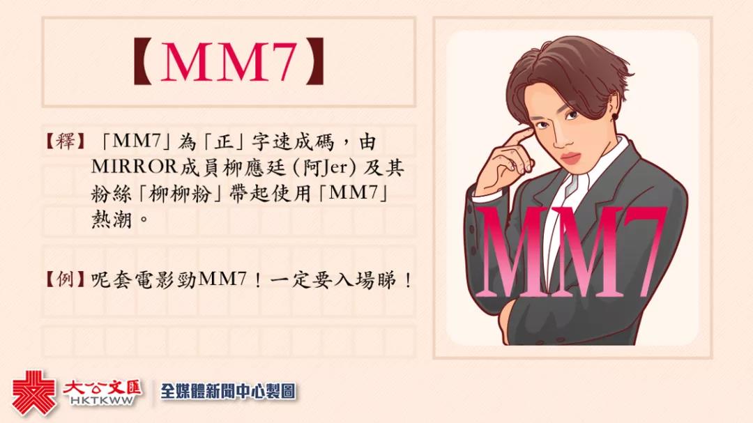 【MM7】:香港偶像組合MIRROR,其成員柳應廷(阿Jer)除咗唱歌好聽,更貢獻唔少潮語!正字的速成碼「MM7」,就係由阿Jer發揚光大。