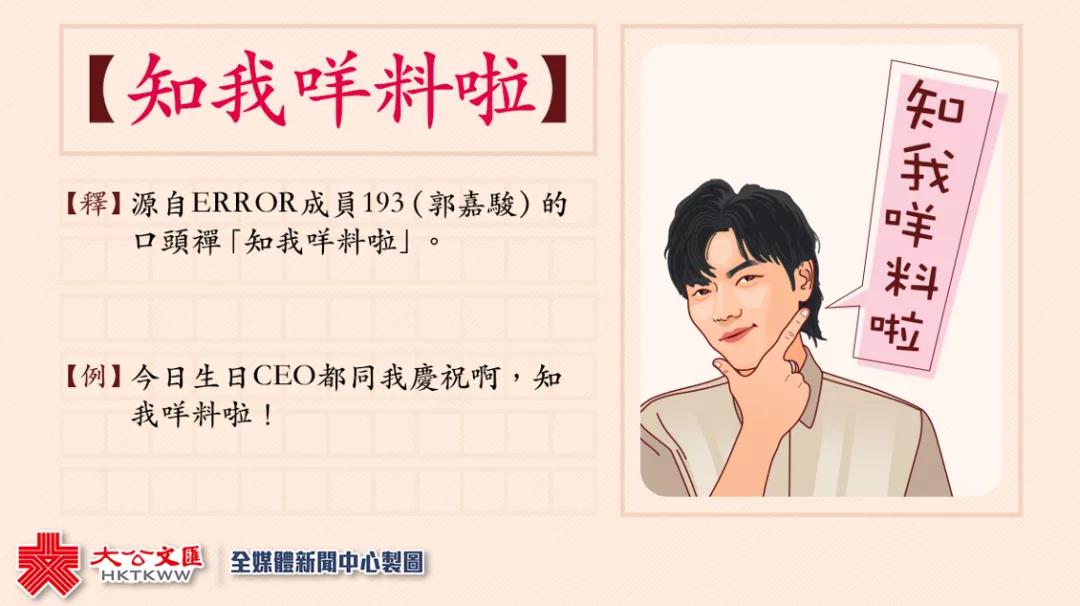 【知我咩料啦】:「知我咩料啦」是藝人193(郭嘉駿)的口頭禪,意思是「知道我的厲害了吧?」