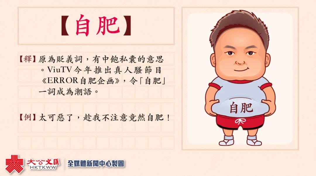 該詞出現在ViuTV節目《ERROR自肥企畫》,ERROR成員利用公司職員來滿足自己的慾望,更出現了經典對白「自肥可恥但很有用」。