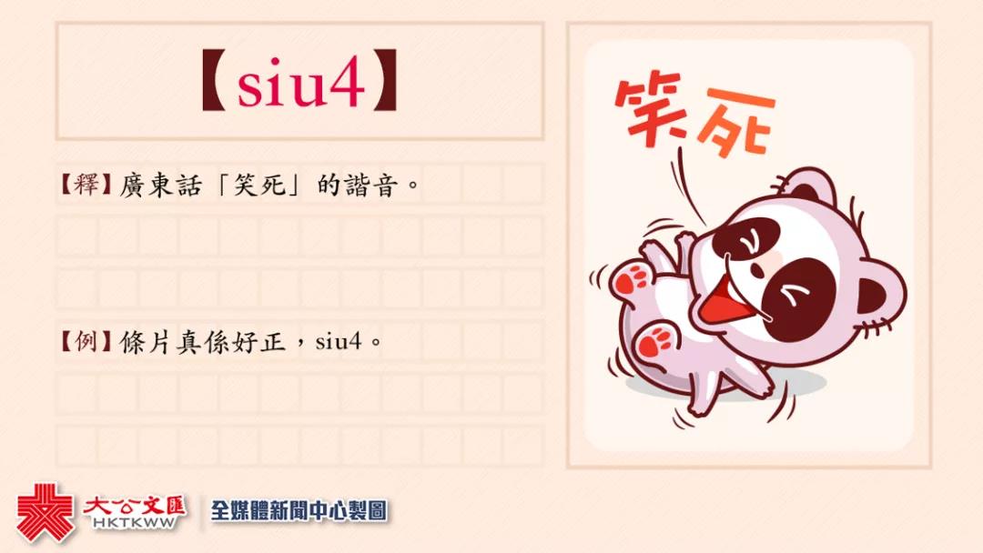 【siu4】:「siu4」廣東話諧音「笑死」,即很好笑的意思,其用法都很簡單,不少人都喜歡用這個縮寫來表達好好笑。