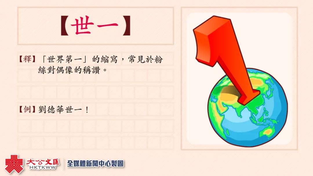 【世一】:「世一」是「世界第一」的縮寫,所以不少粉絲用此「世一」來形容自己心中的偶像。就好像藝人劉德華出道40年,紅了40年,他的演技精湛,唱功了得,簡直就是粉絲心中的「世一」!