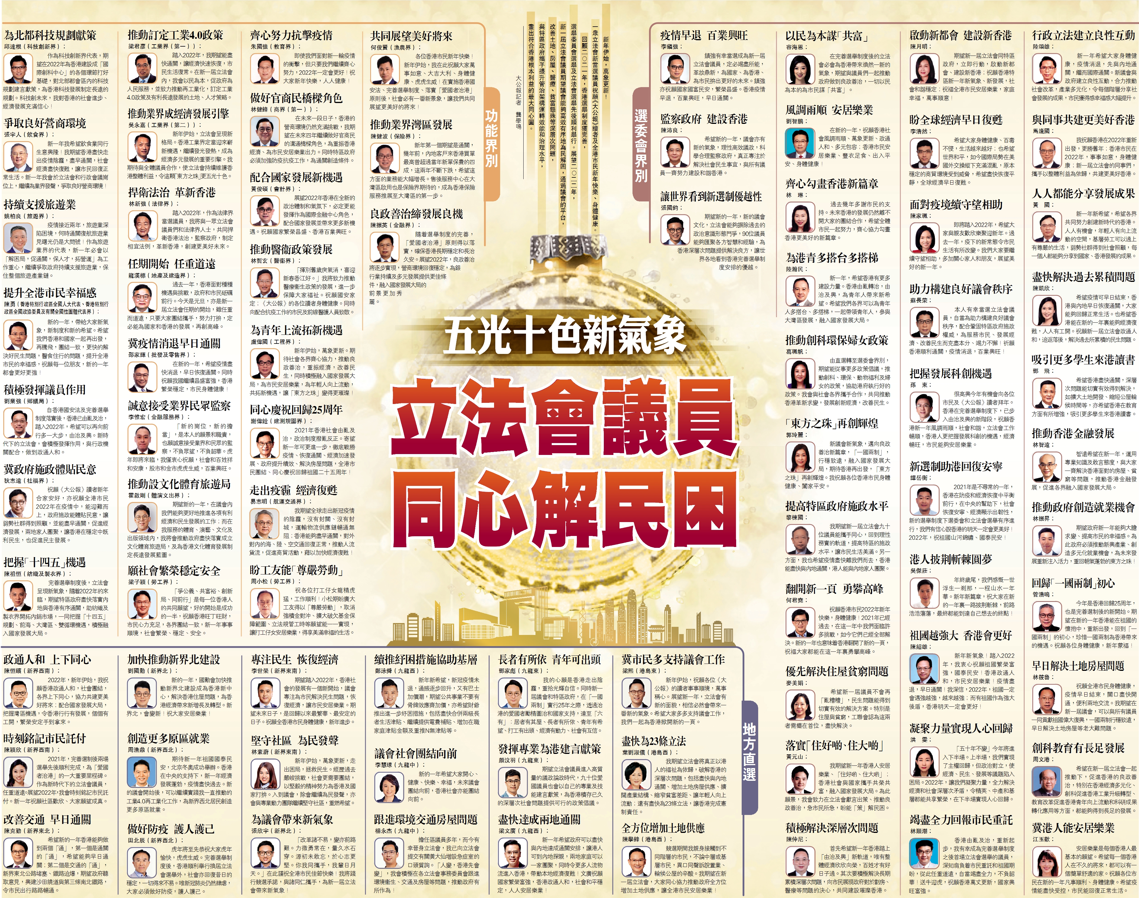 回顧二○二一年,香港選舉制度獲完善,選舉委員會選舉及立法會選舉先後順利舉行。展望二○二二年,新一屆立法會議員期望議會能夠高效有序地為民解困,通過議會的平台,改善土地、房屋、醫療、貧富懸殊等深層次問題,與特區政府攜手提升管治架構運轉效能和治理水平,畫出符合香港根本利益的最大同心圓。