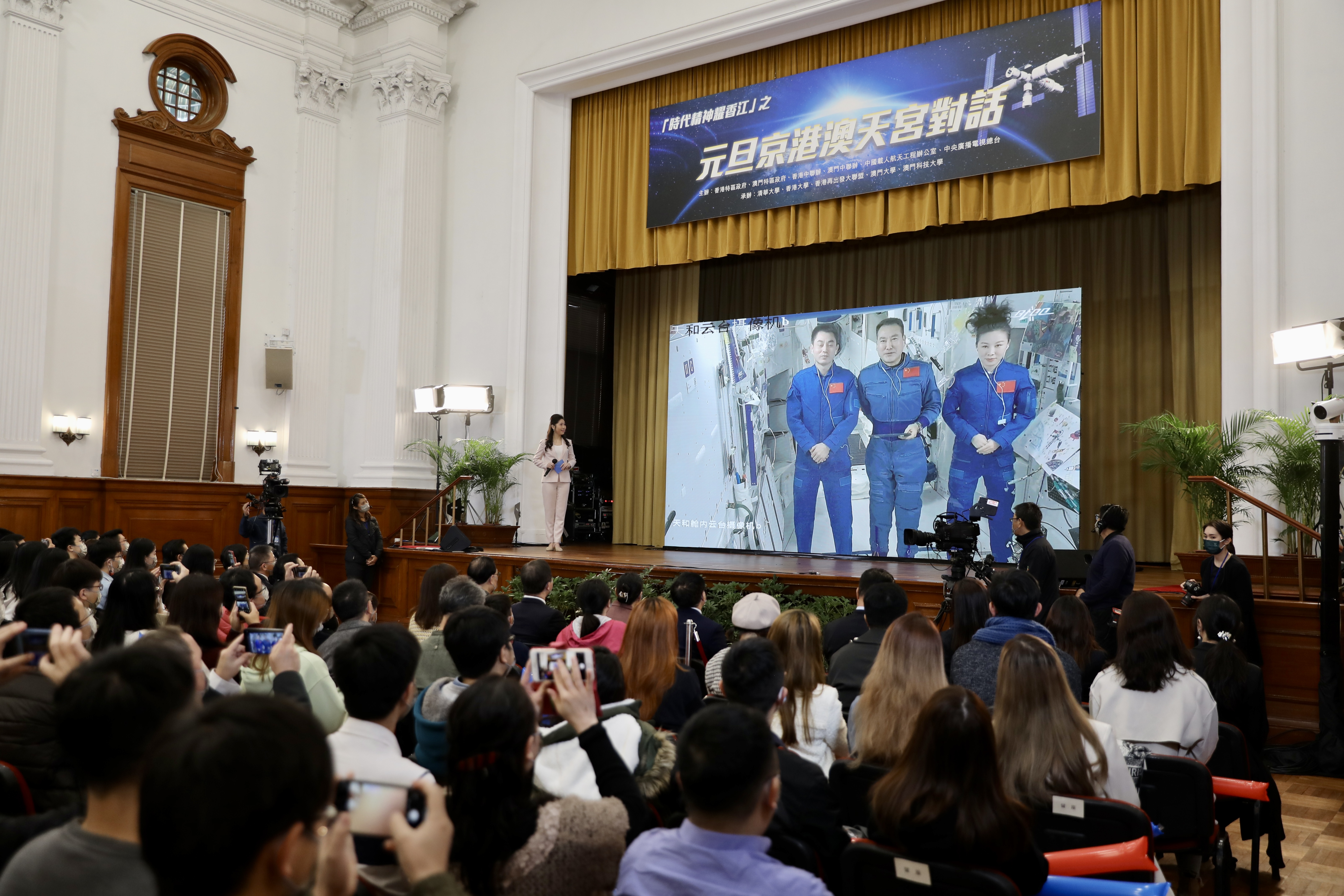 大公文匯全媒體報道,「天地連線」喜迎元旦,在2022年的第一天,香港學子再次迎來一次難得的天地對話交流。「元旦京港澳天宮對話」活動今日(1日)下午舉行,中國航天專家和在天宮空間站的航天員翟志剛、王亞平、葉光富,與來自北京、香港和澳門的近600名青年學子展開互動交流。