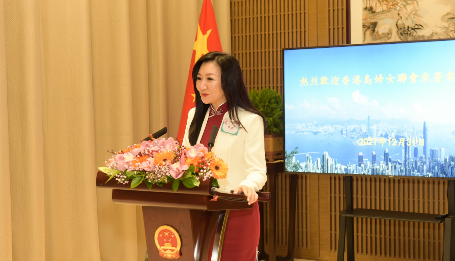 特派員夫⼈、婦女⼩組組長彭⽟英歡迎⼤家在2021年最後⼀天,齊聚⼀堂,共敘友情到外交公署作客。她提到2021年是不平凡的⼀年,我們慶祝了中國共產黨成立100周年,在中國共產黨團結帶領⼈⺠,奮⾾與國的百年光輝歷程中,香港婦女同胞從未缺席。她讚賞香港島婦聯的家國情懷,以行動為香港由亂轉治,由治及興貢獻巾幗⼒量。在立法會選舉前夕,聯同和美家庭⼼連⼼藝術團,連續五個周末通過花⾞巡遊的⽅式,走遍港島各區,宣傳新選舉制度,呼籲⼤家積極投票,為立法會選舉成功舉⾏作出了⾃⼰的獨特貢獻。