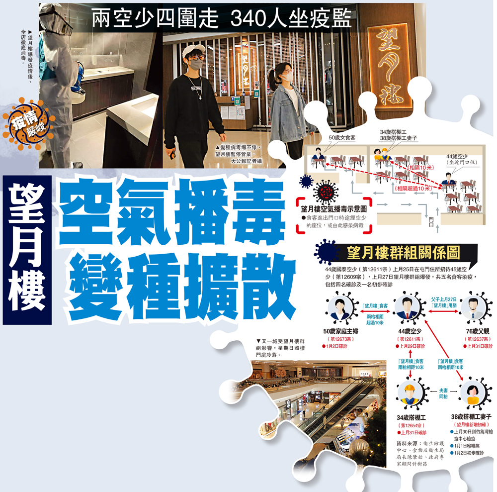 (大公報記者 解雪薇)兩名國泰空少違反家居檢疫令四圍走,令九龍塘又一城的望月樓Omicron群組再擴大,早前確診搭棚工的妻子昨日初步確診,累計已有五人中招,涉及約340人須檢疫,包括170名同一時段食客。食物及衞生局局長陳肇始表示,染疫空少當時坐近望月樓門口,不排除其他人出入時經過空少旁邊,出現短途空氣傳播。