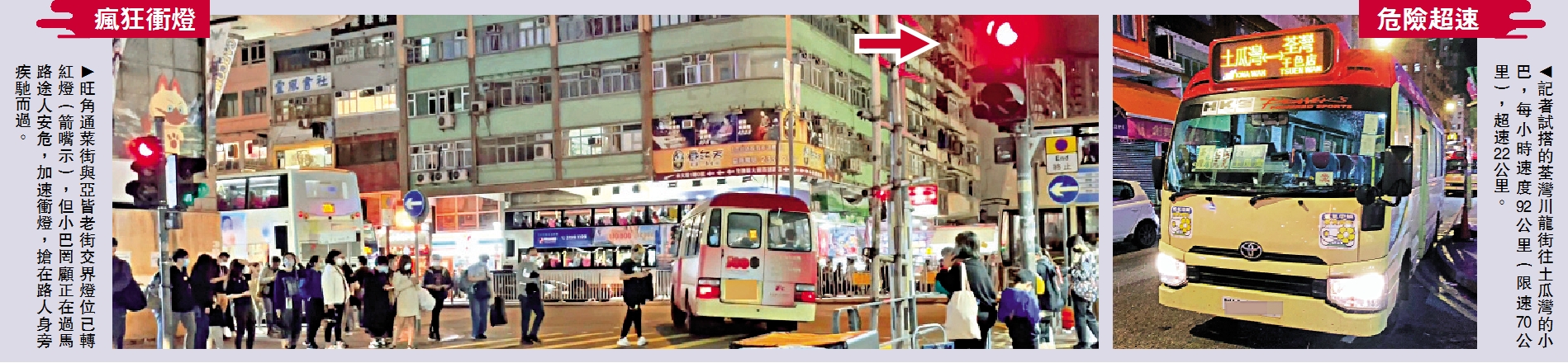 大公報記者近日連續數晚試搭行走港九、新界多區的小巴,發現衝紅燈及超速違例駕駛現象非常普遍,部分限速路段竟然超速高出限定七成,簡直是搵乘客「較飛」。
