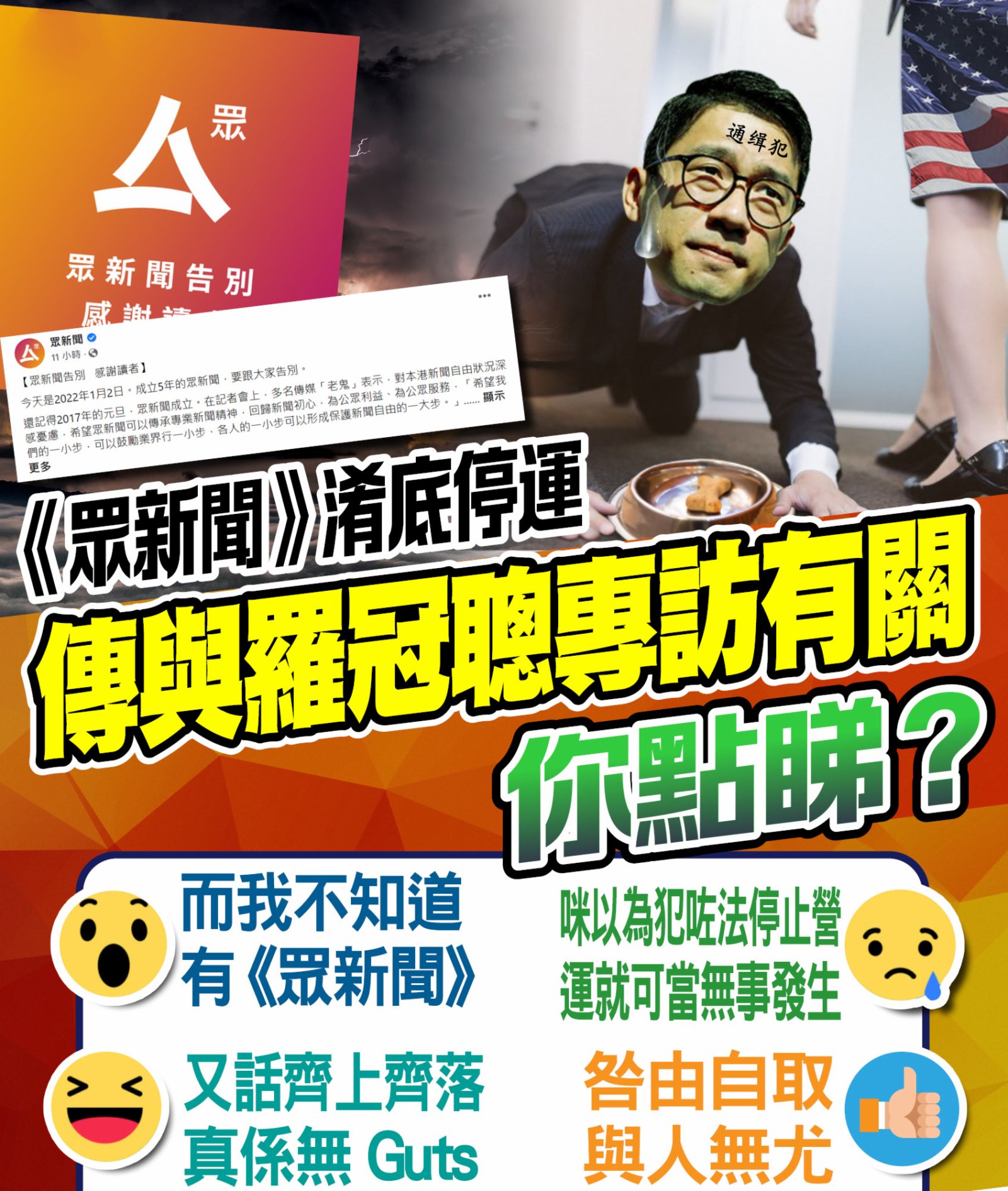 大公文匯全媒體報道:繼與《蘋果日報》關係密切的煽暴網媒《立場新聞》停運後,另一網媒《眾新聞》亦宣稱將於今日 (4日)起停止營運。其主筆楊健興昨會見傳媒時稱坦言停運的觸發點與《立場》被控串謀發布煽動刊物罪後宣告停運有關,擔心《眾新聞》亦觸犯法例。外界猜測可能與去年底美國舉辦所謂「民主峰會」期間,《眾新聞》專訪國安通緝犯羅冠聰有關。