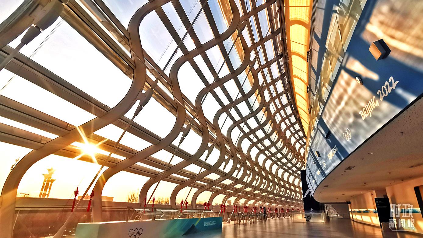 國家速滑館有一個形象的名字——「冰絲帶」。它通體晶瑩,外立面由3360塊曲面玻璃單元拚裝而成。幕牆外有22條高低盤旋、環繞飄舞的「絲帶」。